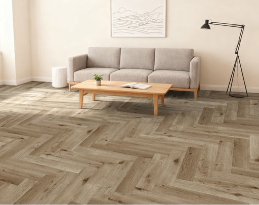 Description du produit : Découvrez notre sol PVC aspect bois chêne clair en motif chevron avec les bords biseautés, imitant à la perfection le chên...